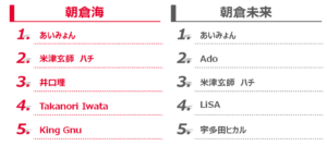 ⑳朝倉海&朝倉未来のSNSフォロワーのフォローアカウント比較_アーティスト・ミュージシャン上位5アカウント